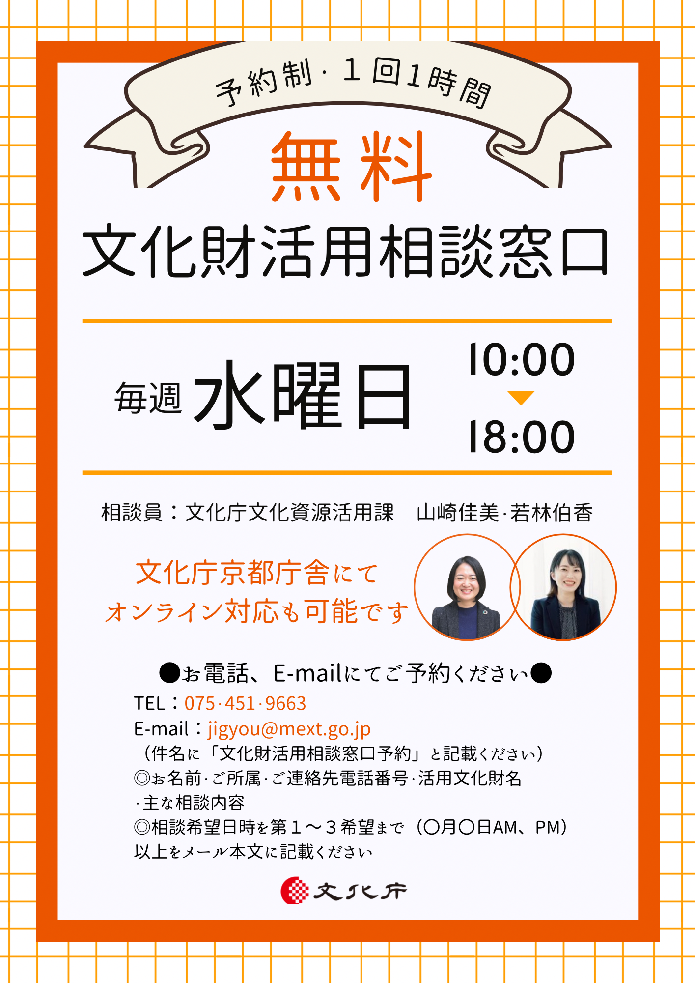 E-mail:jigyou@mext.go.jp(件名に「文化財活用相談窓口予約」と記載ください)