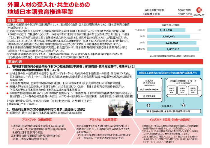 この補助金は,外国人を日本社会の一員として受け入れる社会包摂を念頭に置き,外国人が生活等に必要な日本語能力を身に付けられるよう,地方公共団体が関係機関等と有機的に連携しつつ行う日本語教育環境を強化するための総合的な体制づくり等を行う事業に対して,当該事業を実施するために必要とする経費の一部を補助することにより,「生活者としての外国人」の日本語学習機会の確保を図ることを目的とする。